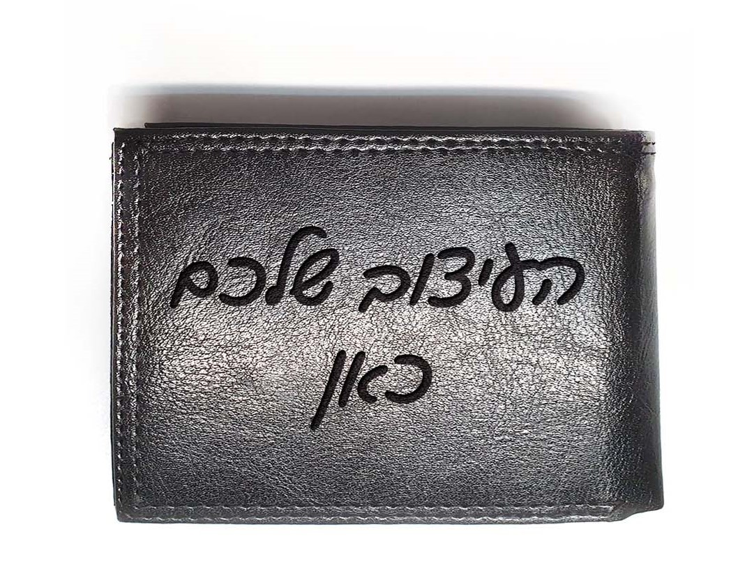 ארנק עור שחור עם חריטת לייזר בעיצוב אישי.