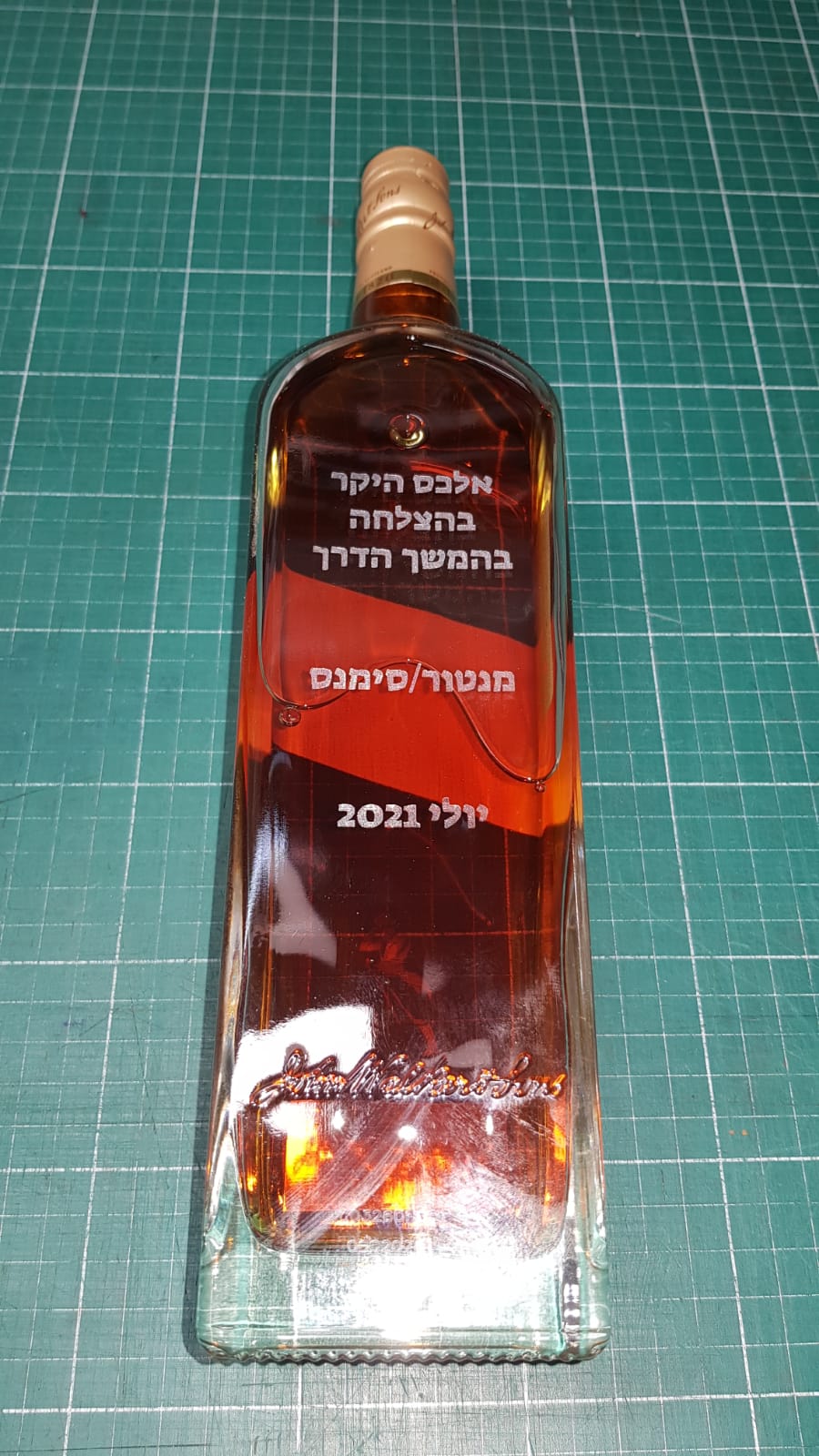 חריטה בלייזר על בקבוק גולד לייבל לייבל ליטר עם חריטה בעיצוב אישי על בקבוק גולד לייבל.מתנה מקורית ונהדרת לכל אחד.
