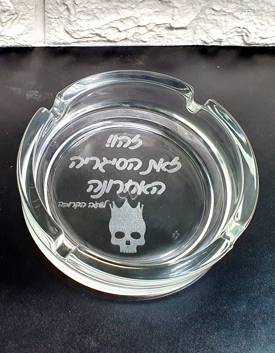מאפרת זכוכית עם הקדשה אישית בחריטת לייזר שתהיה מתנה מגניבה למעשנים!