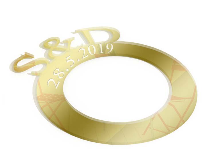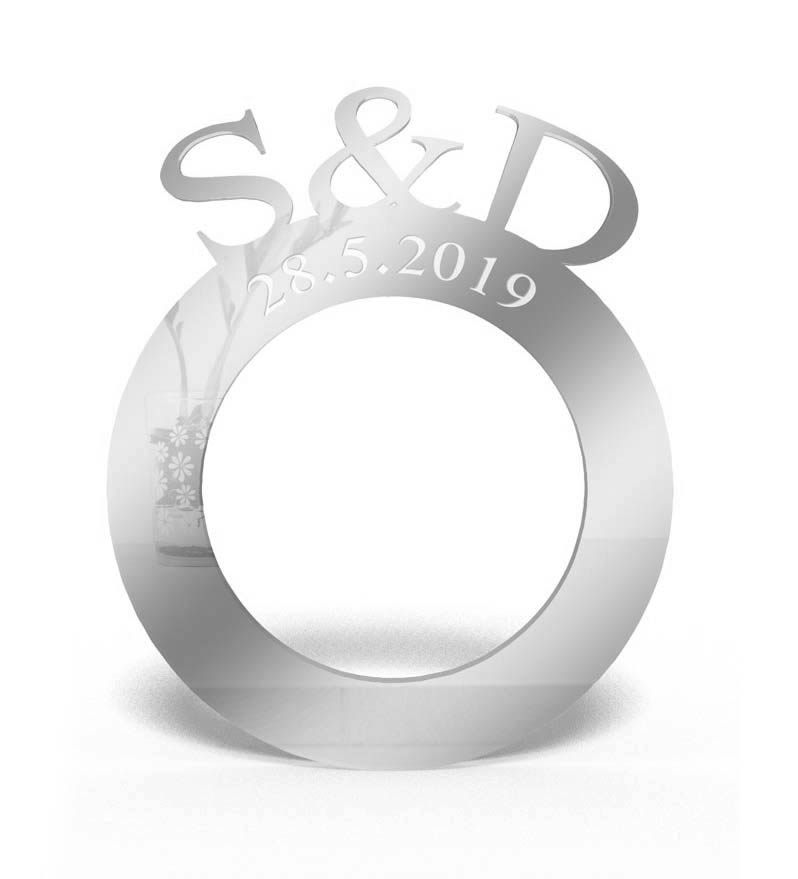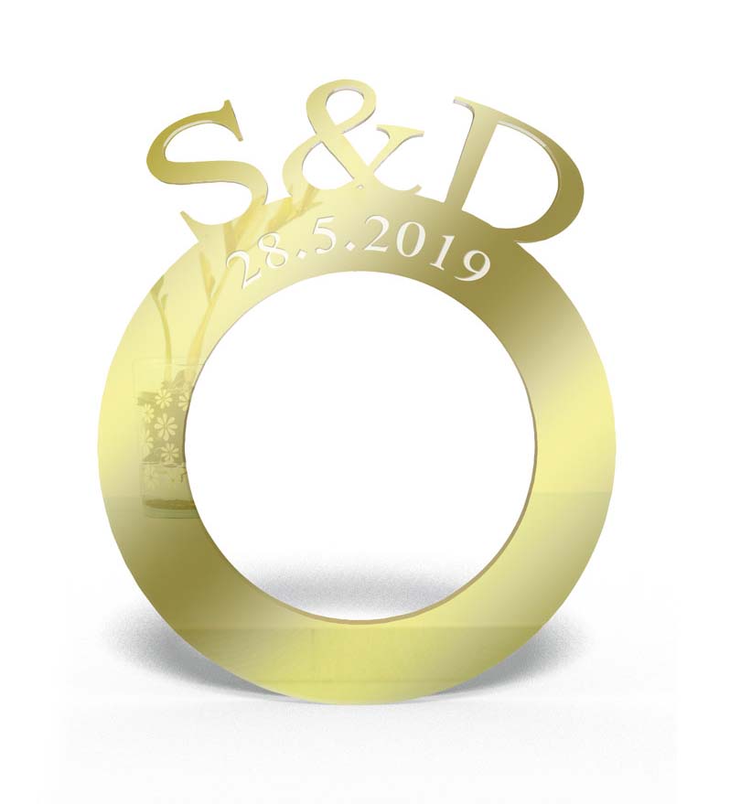 קישוט יפיפה בחיתוך וחריטה של טבעת עם אותיות וחריטה של תאריך החתונה שעשוי מפרספקס מראה זהב או כסף.