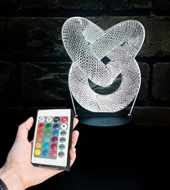 מנורת LED מחליפת צבעים עם פרספקס שקוף וחריטה של צורה תלת מימדית מעוצבת.