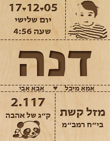 תעודת זהות מתוקה בוק עץ עם חריטה בעיצוב אישי. מתנה מקסימה לבית לאנשים שאוהבים דקורציה ייחודית ומגניבה.המוצר מגיעה בגודל של גובה 30 ס"מ רוחב 20 ס"מ עובי 4 ס"מ.חריטה וחיתוך לייזר איכותי בעיצוב אישי שיהיה קישוט נהדר לכל חדר.